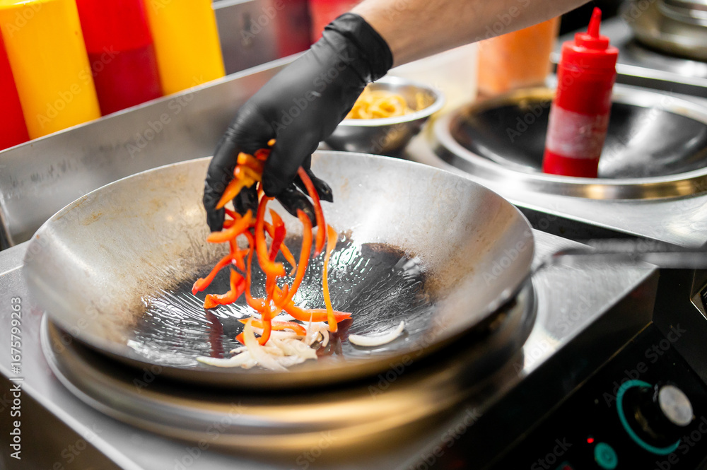 Chef stir-frying sliced bell peppers and onions in a wok on a modern stovetop in a commercial kitchen. Gloved hand, squeeze bottles, and prep bowl visible. Culinary process in action.