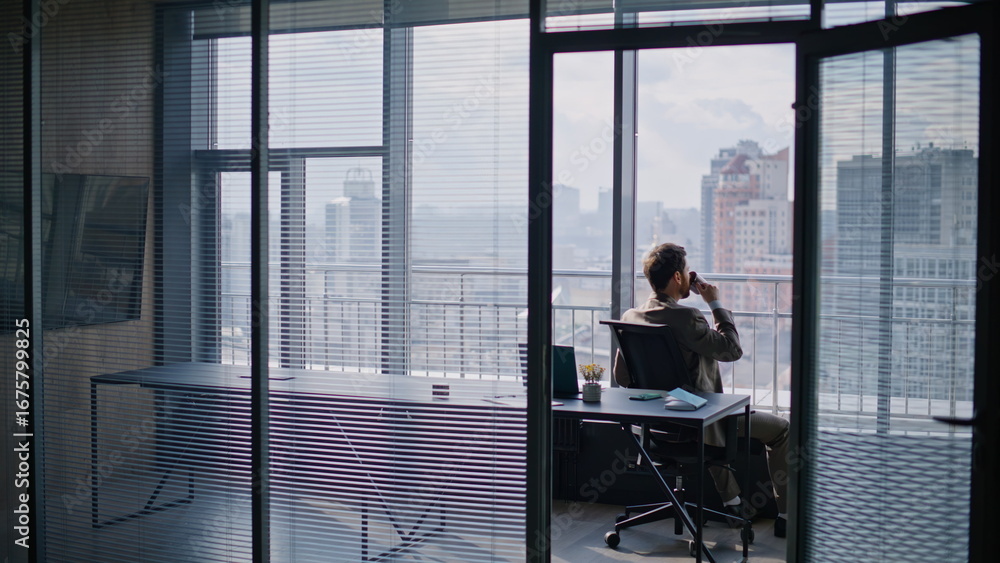 Successful businessman drinking coffee sitting window luxurious private office