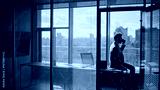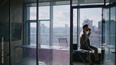 Wealthy businessman enjoying coffee pause sitting office watching large window