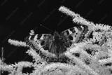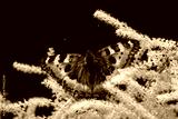 Macro photo of brown butterfly resting on beige blooming amaranth flower