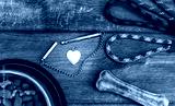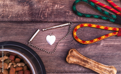 Pet accessories on wooden background. Top view. Pets and animals concept