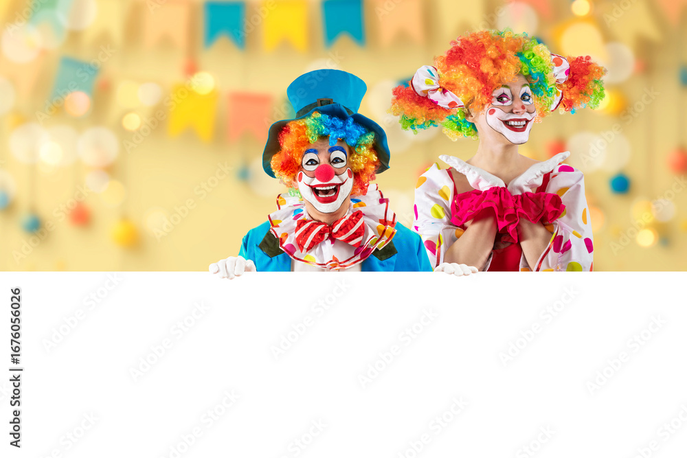 Funny clowns peeking out from behind sign blank template mock up for advertising, posters, greetings, invitations. Entertainers as Joker in a suit and wig, with clown whiteface makeup.