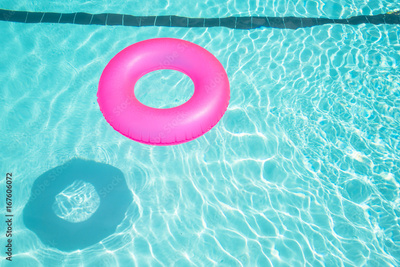 Bright pink float in blue swimming pool, ring floating in a refreshing blue swimming pool with waves reflecting in the summer sun. Active vacation background. Lifesaver for kid. Sunny day at the pool.