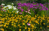 Black-eyed susans, coneflowers, and phlox form an exuberant medley of color in a summer garden.