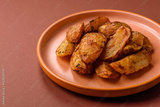 Potato wedges baked with spices, garlic and rosemary. Potato wedges