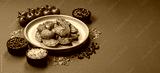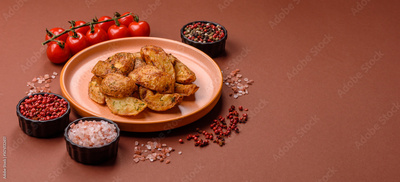 Potato wedges baked with spices, garlic and rosemary. Potato wedges