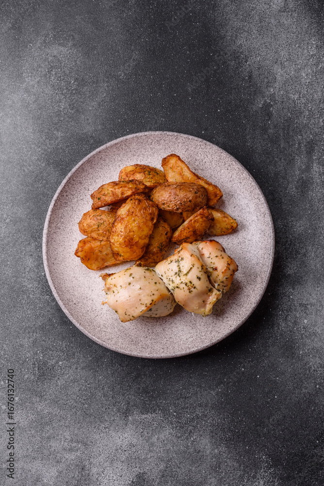 Potato wedges baked with spices, garlic and rosemary. Potato wedges