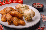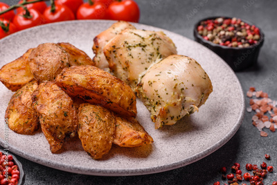 Potato wedges baked with spices, garlic and rosemary. Potato wedges