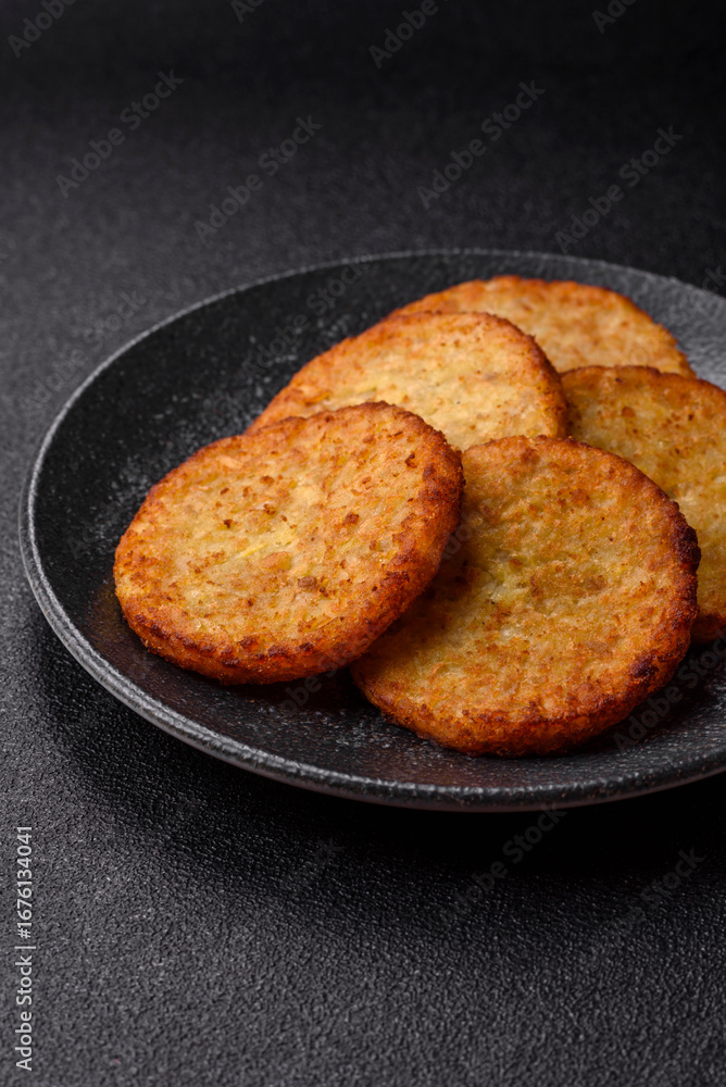 Hash browns, fried potato and onion pancakes with spices for breakfast. Fried hash browns