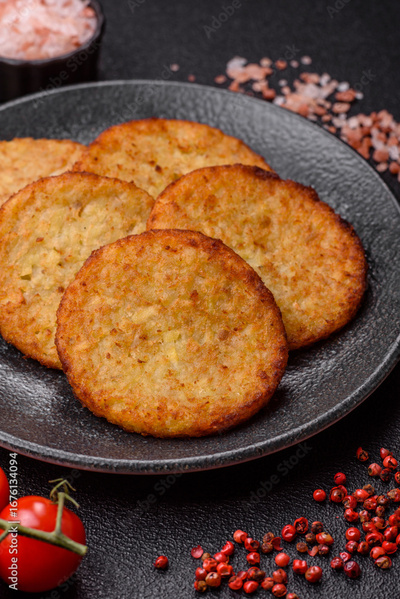 Hash browns, fried potato and onion pancakes with spices for breakfast. Fried hash browns