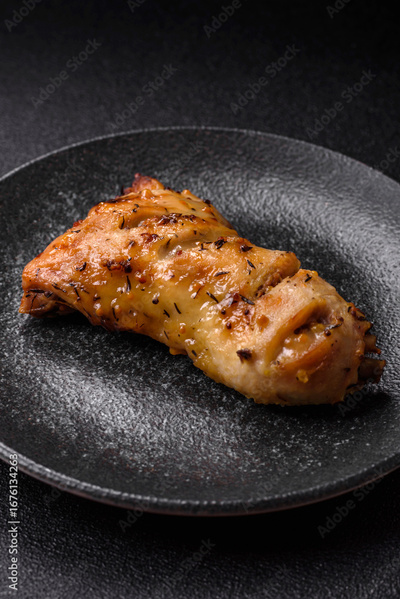Chicken leg, quarter grilled with spices and rosemary. Chicken leg