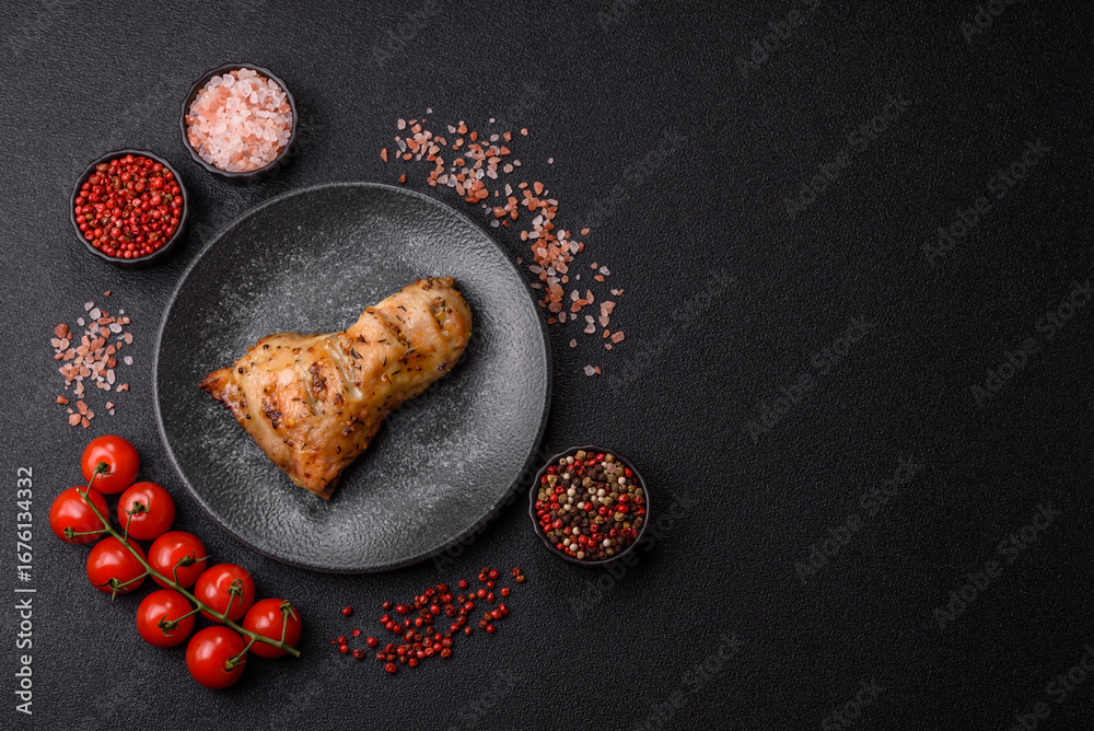 Chicken leg, quarter grilled with spices and rosemary. Chicken leg