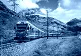 Red Bernina Express train passing through colorful autumn forest in the Swiss Alps, with dramatic clouds, golden trees and snowy mountain peaks in the background in Switzerland. Glacier express train