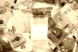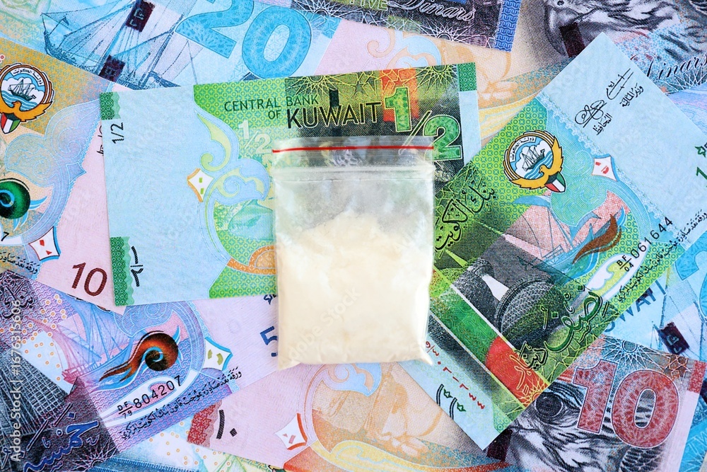 Kuwaiti dinar currency money bills and cocaine pack. The concept of drug trafficking