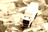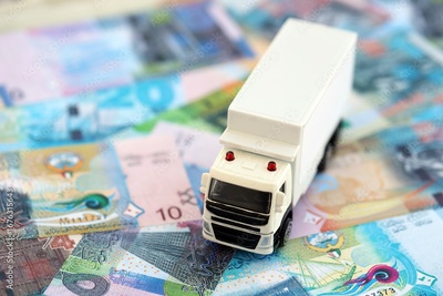 Kuwaiti dinar currency money bills and toy delivery truck. The concept of delivery and logistics