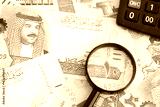 Bahraini dinar currency money bills and calculator with magnifying glass. The concept of taxation