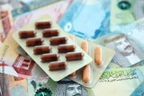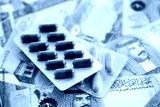 Bahraini dinar currency money bills and medicine pills. The concept of medicine and pharmacy