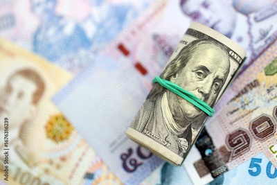 Thai baht currency money bills and bunch of us dollars. The concept of currency exchange