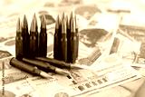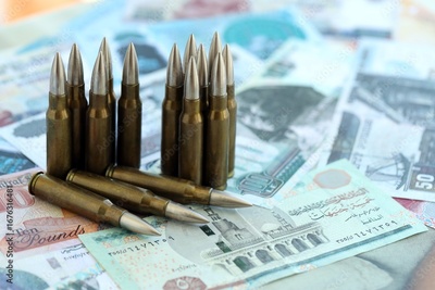 Egyptian pound currency money bills and rifle bullets. The concept of warfare and gun selling