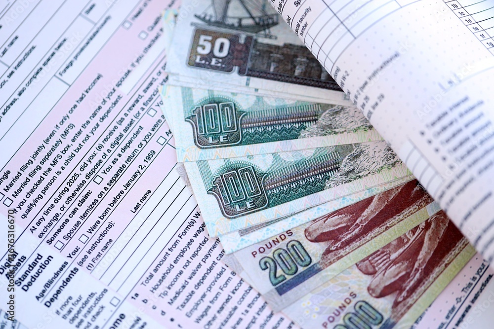 Egyptian pound money bills on tax form. Taxation and accounting concept