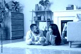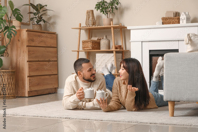 Loving young happy couple with cups of hot chocolate lying near fireplace at home