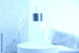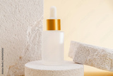 Cosmetic bottles on a stone podium, package for mock up on a beige background. The concept of natural beauty products.