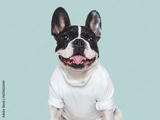 Stylish puppy and t-shirt. Dog smile. Studio shot, isolated background. Closeup, indoors. Pets care concept