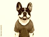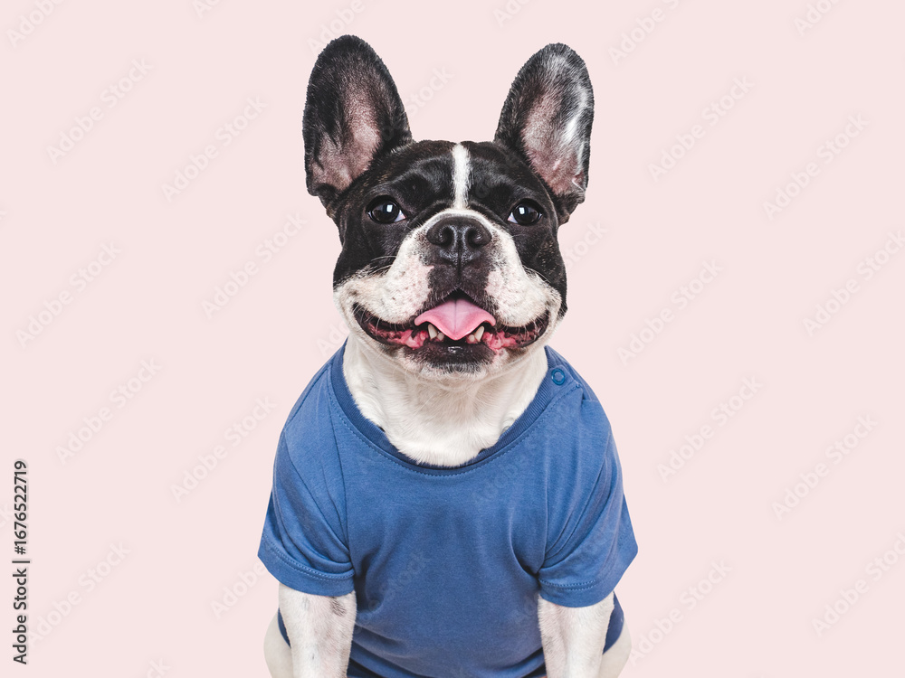 Stylish puppy and t-shirt. Dog smile. Studio shot, isolated background. Closeup, indoors. Pets care concept