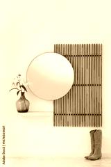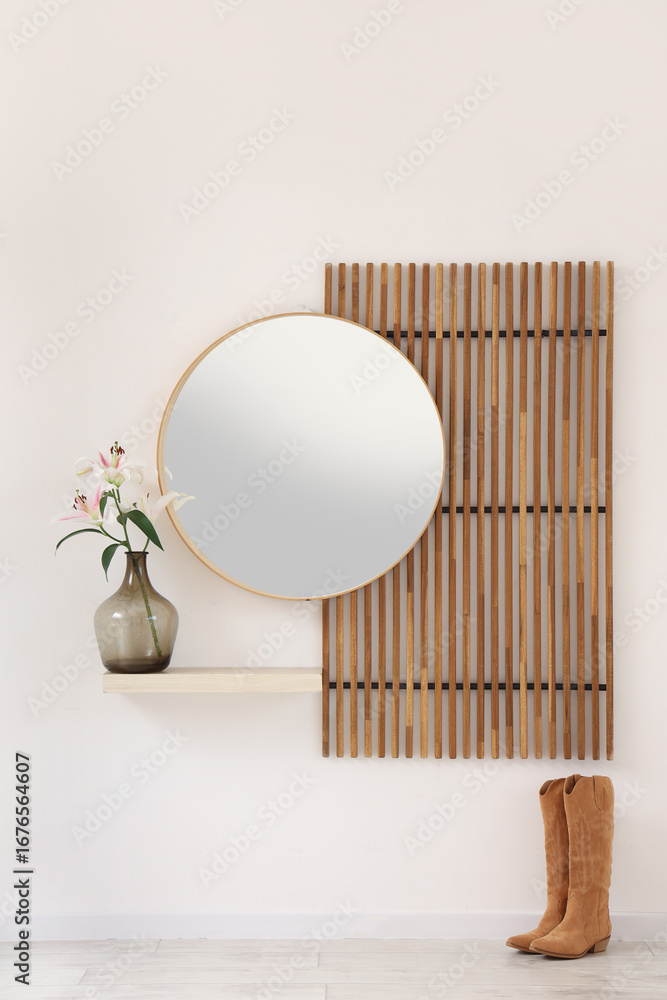 Interior of modern hallway with folding screen, mirror, boots and lily flowers in vase on shelf near white wall