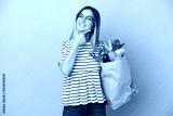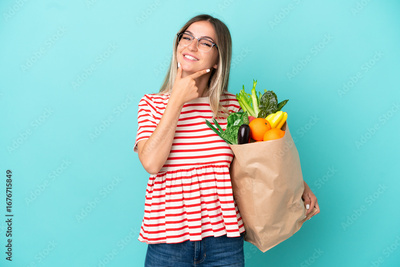 Young woman holding a grocery shopping bag isolated on blue background happy and smiling