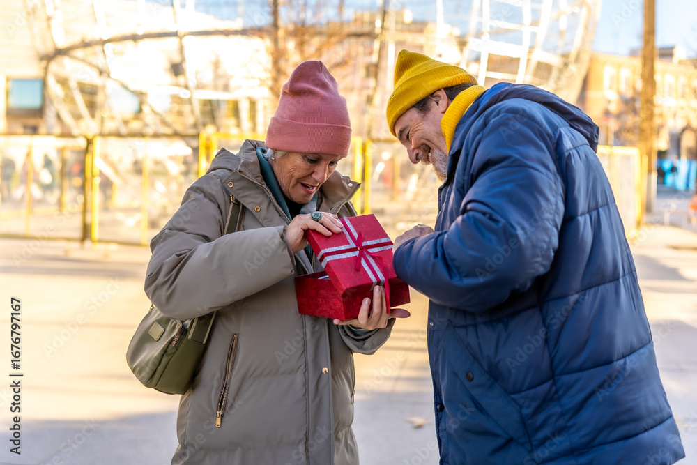 Senior couple opening christmas gift in winter city