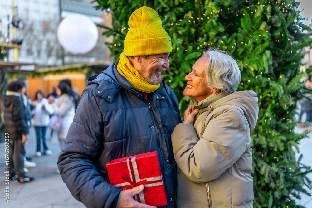 Happy senior couple exchanging christmas gift at a christmas market