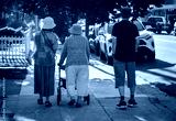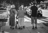 Rear view of an elderly woman walking using a mobility walker on the pedestrian footpath, accompanied by her adult children. California.