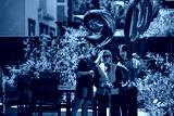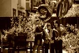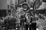 Elderly woman celebrating 90th birthday, with her adult daughters holding balloons. California.