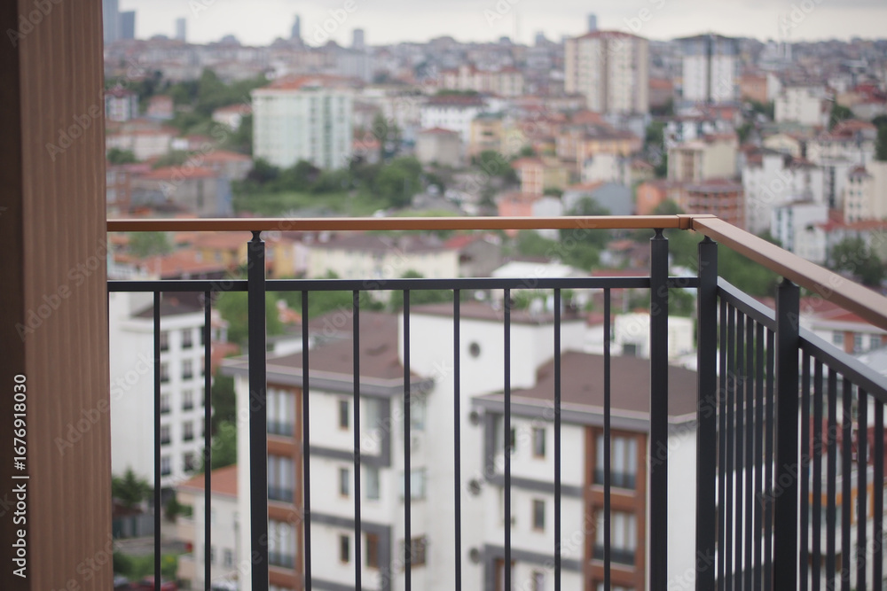 View from a balcony overlooking a city landscape at dusk