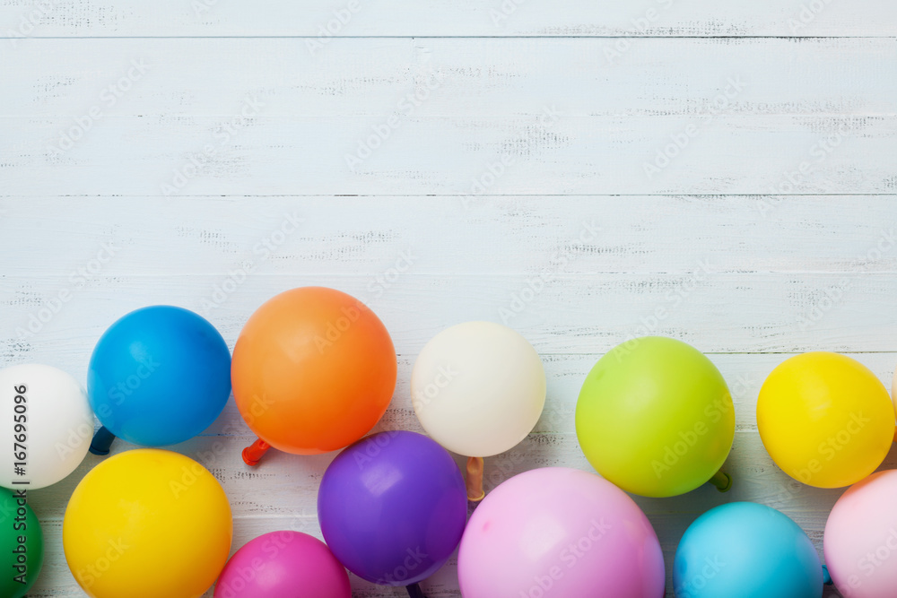 Colorful balloons on blue wooden table top view. Birthday or party background. Flat lay style. Copy space for text. Greeting card.