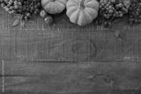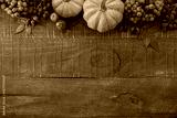 Autumn or Thanksgiving background with pumpkins, bunches Viburnum berries, Rosehip berries, bunches Sorbus berries. Colorful autumn vegetables and berries on wooden table with copy space.