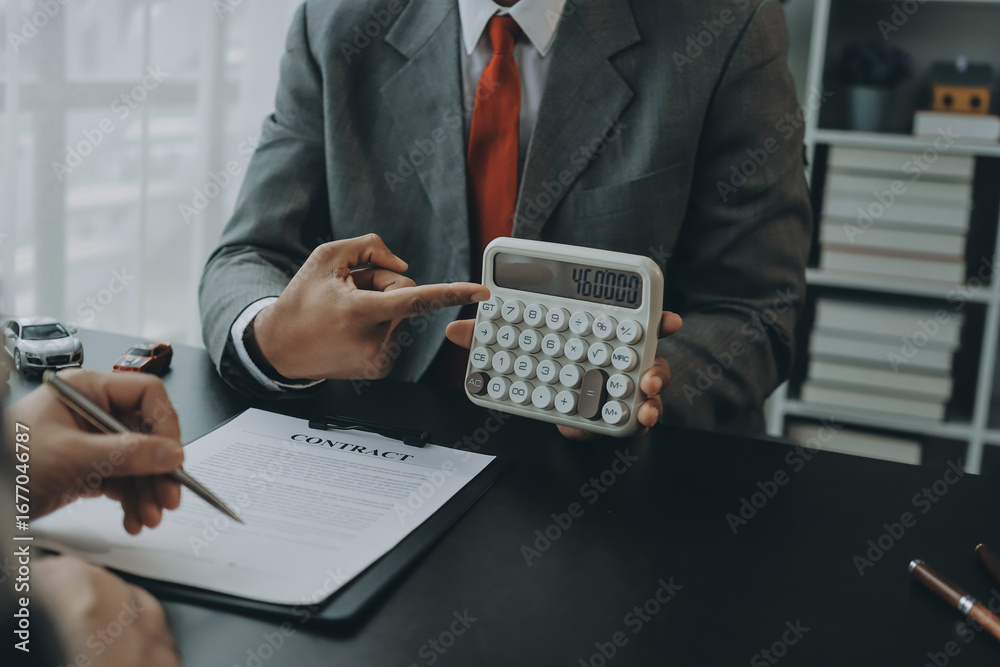 Car salesman gave the keys to the customers who signed the purchase contract legally, Successful completion of car sales, Purchase contract and key delivery.