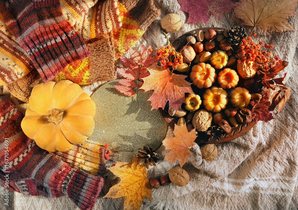 cozy autumn background. Decorative pumpkin shape candles, acorns, nuts, fallen leaves, knitted socks on plaid backdrop. symbol of harvest, Mabon, thanksgiving, Halloween. flat lay
