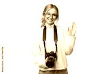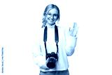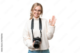 Young photographer English woman over isolated background saluting with hand with happy expression