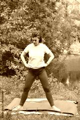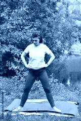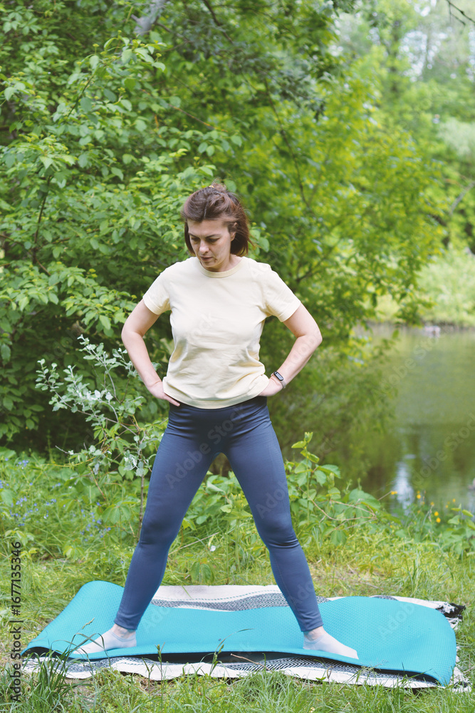 A focused woman practices outdoor yoga or stretching in a serene natural setting by a lake. Embracing wellness, she stands grounded on a mat amidst lush greenery, promoting health and mindfulness.