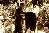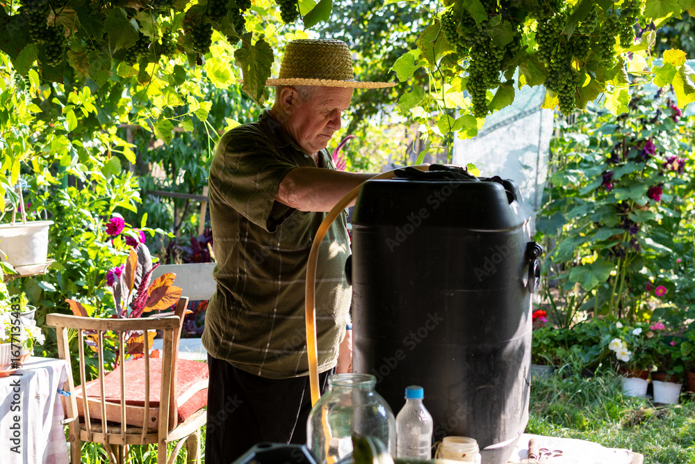 An elderly man in a straw hat expertly transfers liquid from a hose into a black barrel under lush grapevines, embodying traditional winemaking or harvest in a vibrant garden. Authentic rural craft.