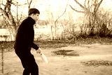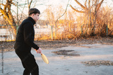 Young man in activewear playing with a wooden paddle outdoors at golden hour, enjoying a casual game in a park. Captures youth and active leisure.