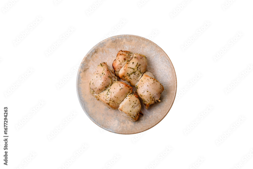 Chicken shish pieces fried on a skewer with salt and spices. Chicken shashlik