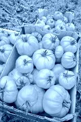 Ripe organic greenhouse tomatoes in a boxes, selective focus.