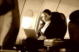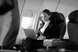 Successful professional business woman focused working laptop computer during airplane flight travel productivity remote work connectivity online
