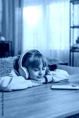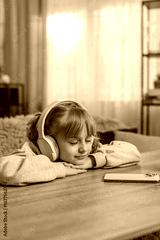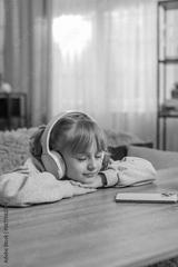 Young girl lying on table listening to an audiobook with headphones, reacting with excitement, surprise. Caucasian child smiles joyfully, wondering what happens next in story, enjoys adventure at home