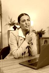 Young businesswoman at home office works on laptop touches cheek feels tooth pain and frowns. Freelancer girl at table pauses typing rubs cheek takes break before return to task and resumes work