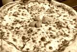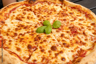Whole full margherita pizza topped with basil leaves double cheese golden melted mozzarella sliced into wedges, middle part closeup detail classic Italian cuisine freshly served restaurant meal nobody