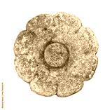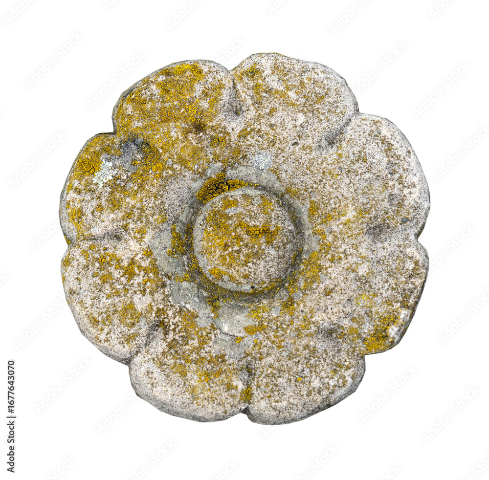 Mossy eroded stone flower rosette ornament single object isolated on white weathered carved decorative design element moss, lichen, circular petals top view, architecture garden sculpture design asset